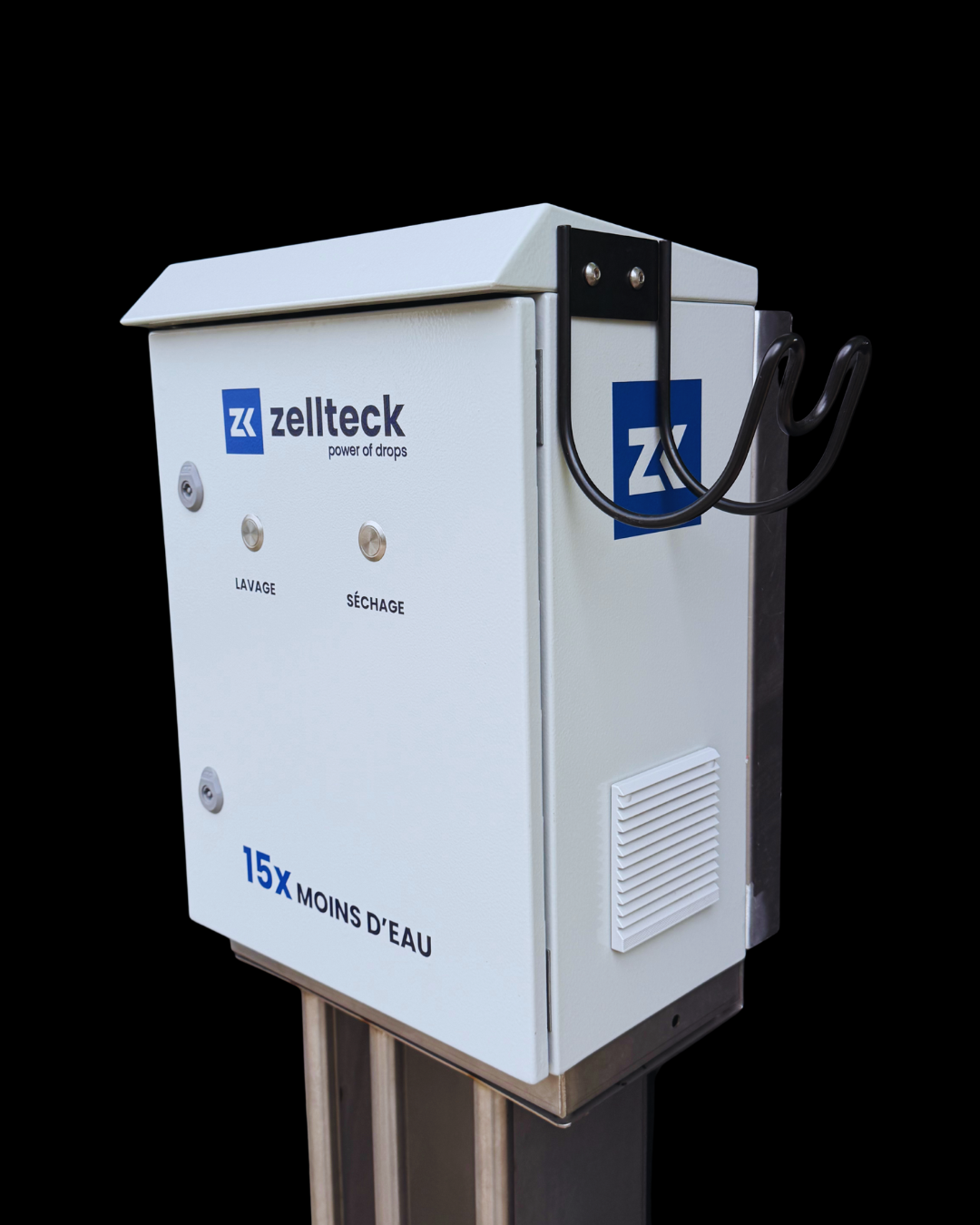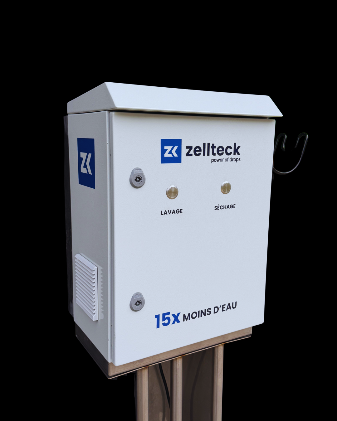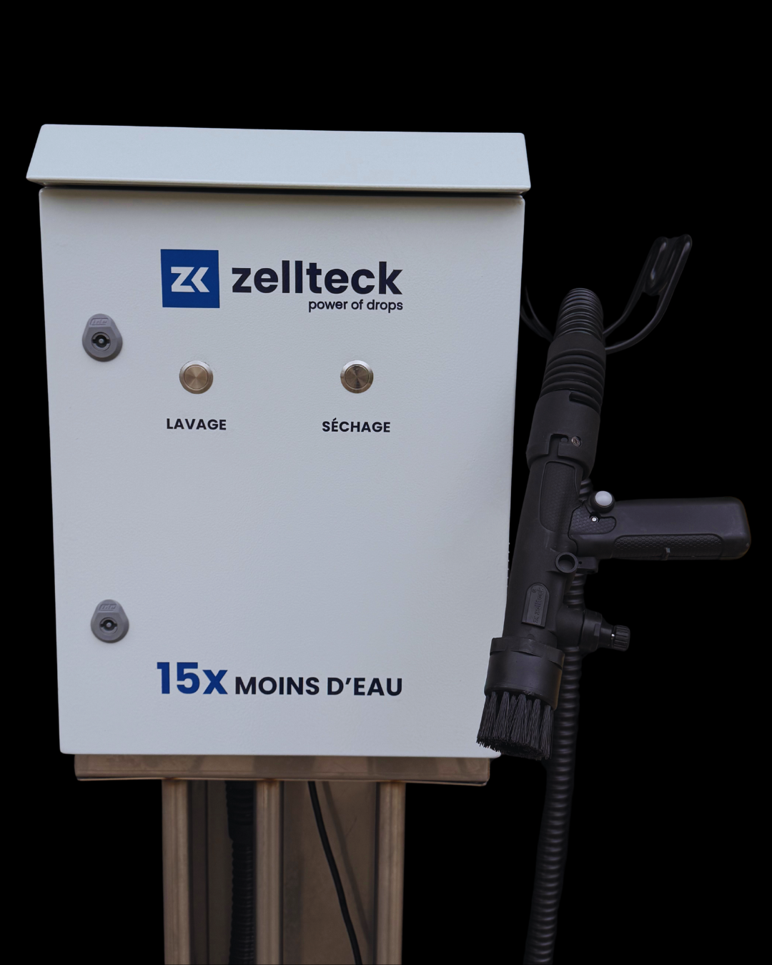 Plaque métallique ultra résistante à l’eau, avec boutons lavage / soufflage intégrés pour un contrôle simple et rapide.